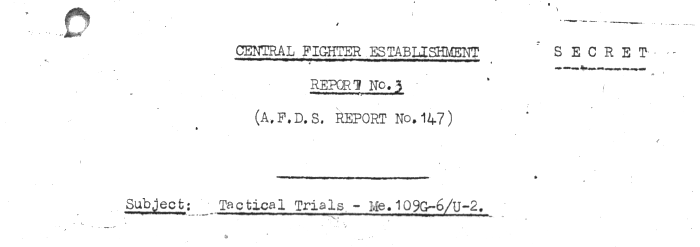 1. In accordance with instruction contained in Air Ministry letter reference S.5217/DAT dated 31.7.44, tactical trials have been carried out by this Unit on aircraft No. TP.814. Tactical comparisons have been made with the Spitfire IX, Spitfire XIV, Mustang III and Tempest V. Prolonged unserviceability of the Me.109 prevented earlier completion of the trials. Unfortunately the aircraft crashed towards the end of the trial before check comparison had been carried out with the Tempest V. The report therefore includes the figures from a previous trial between the Tempest and a Me.109G flown by a pilot of 1426 Enemy Aircraft Flight.
