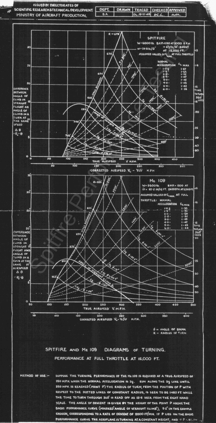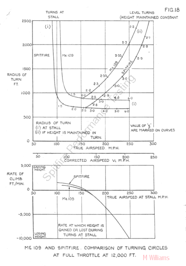 F/O D. McMullen with 222 Squadron at Hornchurch wrote on his Combat Report for 15 October: I was leading the squadron, flying at 20,000 feet, when I saw two smoke trails approaching above me. I climbed and chased them same way. E/A then turned and came back through us. I engaged one E/A firing approximately one half my ammunition. Another Spitfire overshot me so I then engaged the second one. Both the E/A dived steeply towards cloud. I chased the second E/A at about 100 ft. out to sea over Hythe. Owing to the windscreen freezing up and extremely bumpy air I was handicapped. I overtook E/A easily without 12 boost. One piece of fuselage appeared to fall off. 72 P/O G. A. W. Bodie of No. 66 Squadron recorded in his Combat Report for 25 October 1940: I followed using 12 lbs boost... 72b The DB 601A data charted above comes from the DB 601 A u. B Moteren-Handbuch of May 1942, which includes a 1 minute take-off rating. The Betriebs und Wartungsvorschrift zum Mercedes Benz Flugmotor, DB 601 A u. B., Ausgabe C, October 1940 also notes a 1 minute take-off rating. 23c The highest permissible values in climb and level flight were 1.3 ata and 2400 RPM. 23d A clockwork mechanisim limited take off boost to 1 minute only.23e The take-off rating was not mentioned in the Me 109 E Flugzeughandbuch; the maximum engine limits are stated as 1.3 ata, 2400 rpm. ![]() The RAE determined in Report No. B.A.1640 that "The minimum radius of turn without height loss at 12,000 ft., full throttle, is calculated as 885 ft. on the Me 109 compared with 696 ft. on the Spitfire." and that the corresponding time to turn through 360 deg is 25 seconds for the Me 109 and 19 seconds for the Spitfire. 73 (See also Me 109 and Spitfire. Comparison of Turning Circles and Spitfire and Me 109 Diagrams of Turning). 60 years later Dr. John Ackroyd, PhD, C.Eng, FRAeS of the Aerospace Division, Manchester School of Engineering, University of Manchester, and Fellow of The Royal Aeronautical Society, took a fresh look at this subject in his paper "Comparison of turning radii for four Battle of Britain fighter aircraft". He calculated the minimum turn radii to be 686 feet for the Spitfire IA versus 853 feet for the BF 109 E-3 - which is in very good agreement with the RAE's findings. 74 Jeffrey Quill wrote of his combat experience whilst flying with No. 65 Squadron: Nearly all our engagements with Me 109s took place at around 20,000 - 25,000 ft. The Spitfire had the edge over them in speed and climb, and particularly in turning circle. (...) One engagement with several Me 109s at about 25,000 ft over the Channel sticks in my memory. It all happened very suddenly; in fact we were mildly 'bounced' and soon I found myself behind two 109s in a steep left-hand turn. I was able to turn inside the second one and fired at him from close range. He went on pulling round as sharply as he could. I followed him without any difficulty and went on firing bursts at him. There were puffs of black smoke and then a trail of white vapour streamed from his aircraft. By this time I could no longer see the first 109 and then realized that he was on my tail. As I was by now just shuddering on the verge of a g-stall, I quickly turned inwards and dived. I pulled up again when I was sure I had shaken him off... I was pleased with that little episode � partly because I was damn sure that the first 109 was not going to get home and also because I was now convinced that the Spitfire Mk I could readily out-turn the 109, certainly in the 20,000 ft region and probably at all heights. 75 F/Lt Al Deere (NZ), with No. 54 Squadron during the Battle of Britain, commented: My experience over Dunkirk had taught me that when attacked the best counter was to go into a right turn. In this manoeuvre, the Spitfire was infinitely superior to the Messerschmitt, and so long as one remained in the turn, the enemy pilot could not bring his guns to bear. And this I did, as the German pilot flashed past, turning as he did so to get behind me. But it was I who finished astern of him. The rest was easy. 76 F/Sgt William H. Franklin of No. 65 Squadron recorded in his Combat Report for 25 June 1940: 65 Squadron on offensive patrol North of Abbeville sighted about 12 ME.109 at about 15,000 feet. We attacked per section, I was Blue 2. An enemy aircraft circled on to my sections tail and I broke away to engage, but Blue 3 got there before me. I was then attacked by 2 enemy aircraft, and turned sharply to get on the tail of one. I manoevured into position on his tail and fired a very short burst at about 200 yards. Enemy aircraft burst into flames and dived vertically. I was now engaged by second enemy aircraft. I manoevured onto his tail, as 2 other enemy aircraft attacked me from the rear. I broke away and after considerable manoevuring we had lost height to 4000 feet. One Me.109 again attacked from behind but I was able to turn slightly and get on his tail. I followed him as he turned and seeing me closing on him he half rolled. This brought the other two aircraft out of position for attack on me. I followed inside the first enemy aircraft and fired two very short bursts at about 250 yards and I saw enemy aircraft dive into the ground. 77 F/LT John Ellis of No. 610 may have learned from Deere's experience, recording in his Combat Report for 24 July 1940: I was the leader of 610 Sqdn. which was sent to attack e/a attacking shipping N. of Margate on 24/7/40. The Squadron left Hawkinge at 1230 and climbed through 3,000 ft of cloud which was down to 400' over the aerodrome. We came out of the cloud over Margate and as we had penetrated the cloud by sections I gave orders for the sections to rendezvous over the convoy which was 5 miles N. Margate. While circling the Convoy Green 1 called me up to say he was on my starboard beam and below. I sighted green section immediately but at the same time saw three Me 109's diving down in vic to attack them so I gave orders for green section to do a tight a tu
